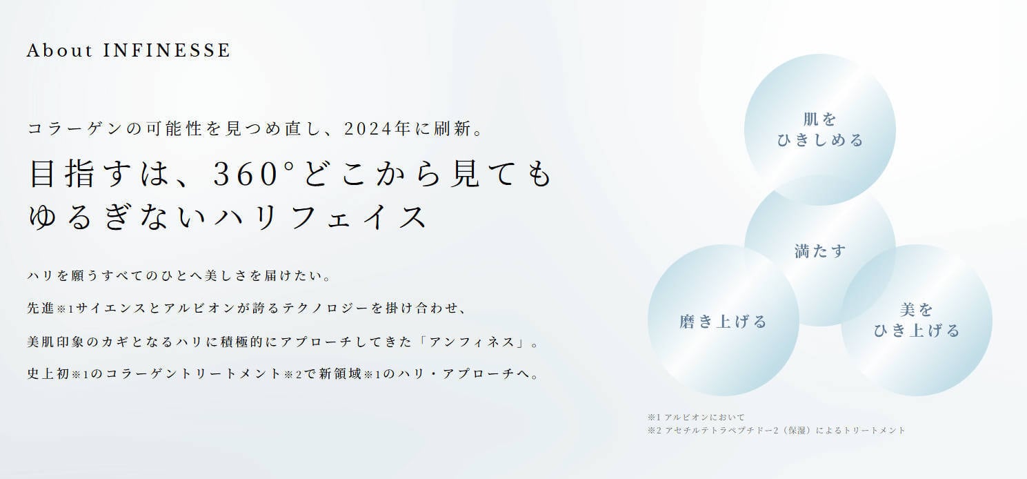 まろやかなコクのあるベースがみずみずしくのび広がり、明るく冴えわたりピンとひきしまったハリ肌へみちびきます。
