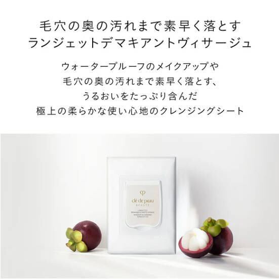 卓越した手応え ○肌にやさしい柔らかなシートが、ウォータープルーフのメイクアップや毛穴の奥の汚れまでしっかりと取り除き、クリアですっきりとした肌へ導きます。 〇空気中の微粒子(ちり・ほこり・花粉など)を取り除き、肌を清潔に保ちます。 〇ヒアルロン酸を配合し、みずみずしいうるおいを肌にもたらします。 〇ペパーミントエキス配合により、肌のきめを整えながら、美しくしなやかな肌へ導きます。 〇アルガンオイル*とツバキオイル**を配合した柔らかなシートが、デリケートな目まわりの肌までやさしく包み込み、しっとりとしたうるおいでまつ毛まで守ります。 *保湿成分 **毛髪保護成分 知性を結集させた技術と成分 〇洗うたびうるおいで満たされる肌環境に整える独自技術、レジリロックテクノロジー採用。 ○肌本来の水分レベルとpHバランスを自然な状態に保ちます。 〇薬品や接着剤を使わず水のみで繊維を編みあげ、天然由来素材の肌にやさしいシートを採用。 〇肌を美しく輝かせる果樹の恵みに着目、クレ・ド・ポー ボーテ インテリジェントフード「マンゴスチンエキス」(肌保護)配合。 肌に応える歓び 〇極上の柔らかなシートに美容洗浄成分をたっぷりと含ませ、使うたび贅沢な心地よさをもたらします。 〇希少なランや天然ローズにインスパイアされた、清らかな優しさに満ちた、優美な香りです。