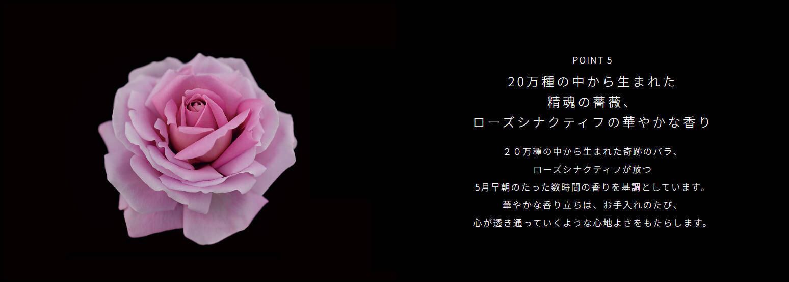 20万種の中から生まれた奇跡のバラ、ローズシナクティフが放つ5月早朝のたった数時間の香りを基調としています。華やかな香り立ちは、お手入れのたび、心が透き通っていくような心地よさをもたらします。